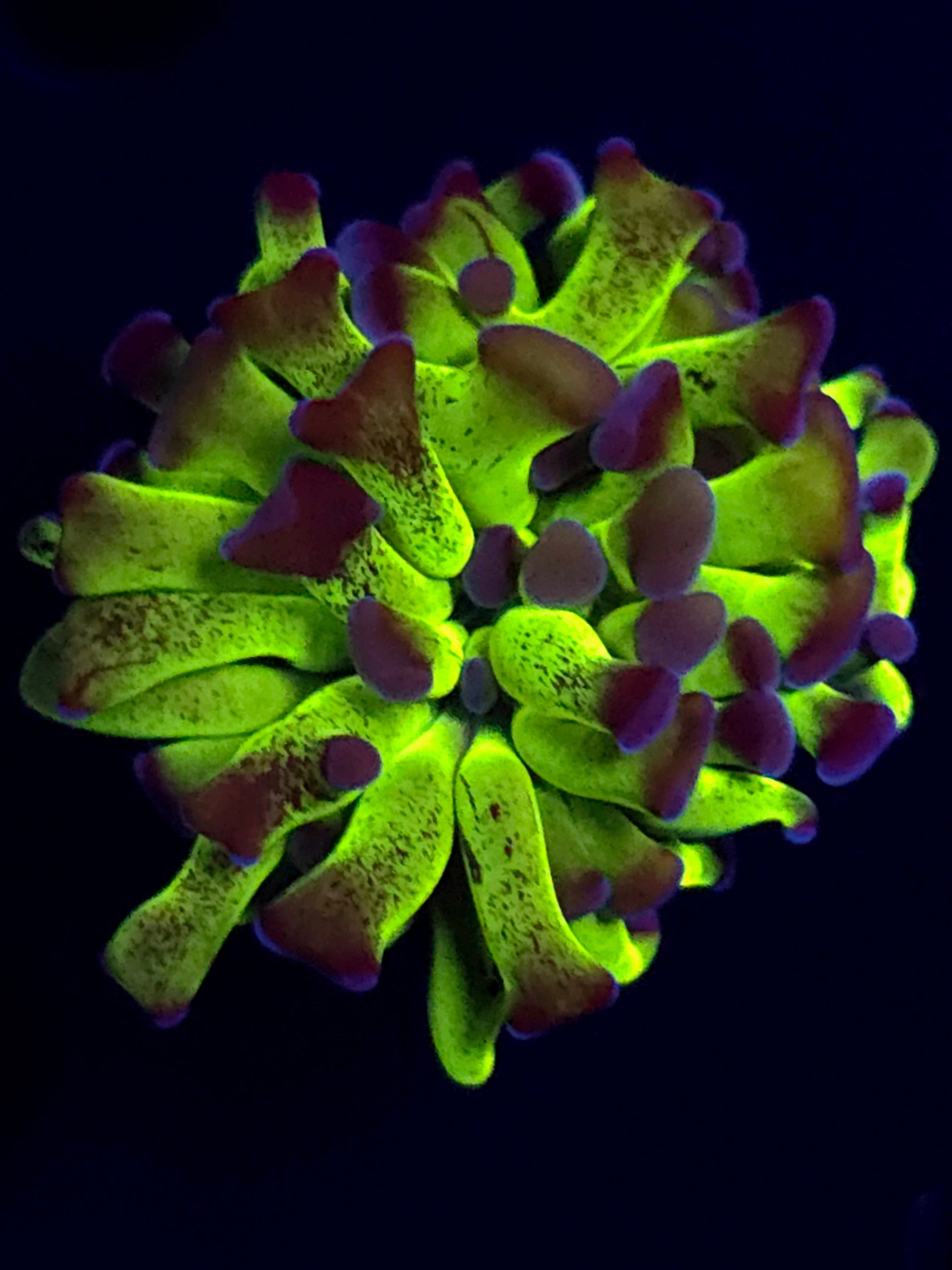 A Branching Hammer Coral (Euphyllia ancora or Euphyllia paraancora) is a popular large-polyp stony (LPS) coral known for its unique, hammer- or anchor-shaped tentacle tips. It can extend long sweeper tentacles at night to sting and damage nearby corals. It is crucial to provide ample space between it and other coral species.