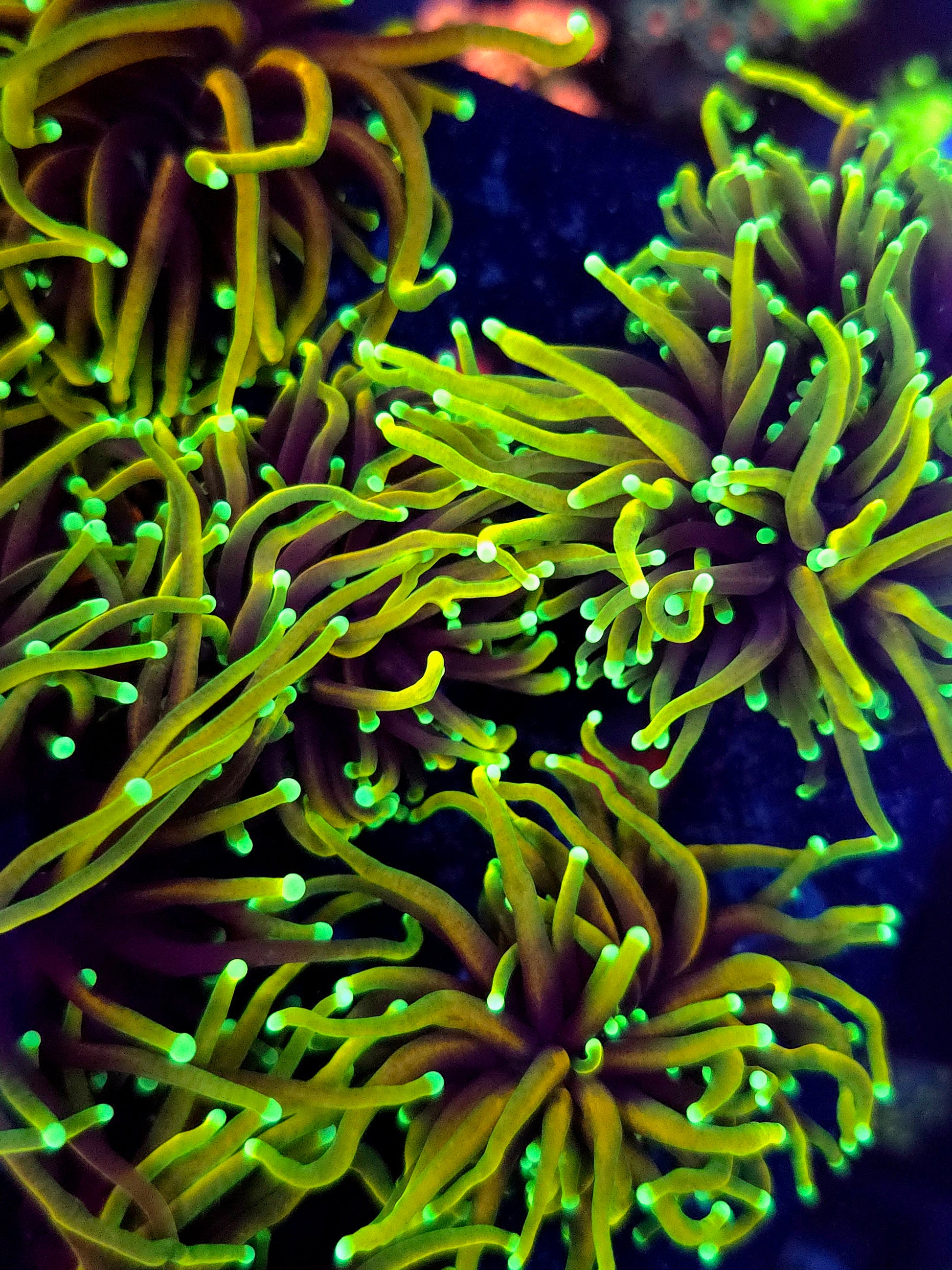 A Torch Coral (Euphyllia glabrescens) is a type of large-polyp stony (LPS) coral known for its long, flowing tentacles with a single, glowing tip that resembles a flaming torch. They are famous for their mesmerising, graceful movement in the water current and come in a variety of stunning colours creating a brilliant visual effect under aquarium lighting.